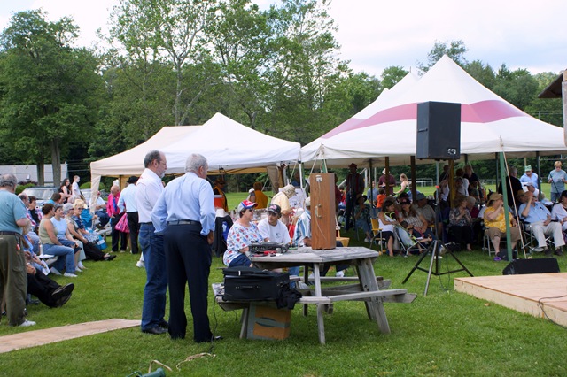 In addition to the vendors of quilts, pies and more, under the tent thanks to the Sullivan County Historical Society and Johnny Darling descendents Mimi Marion Darling Glancy and Bridget Biggs from Arizona, visitors were able to peruse photographs and memorabilia of Johnny and his family collected over the years. Mimi and Bridget’s cousin Mel Darling from Ilion, NY was ill and could not make the trip, however the girls made sure he was included in the day’s adventures by having their photo taken with a cut-out of Mel which they sent to him.