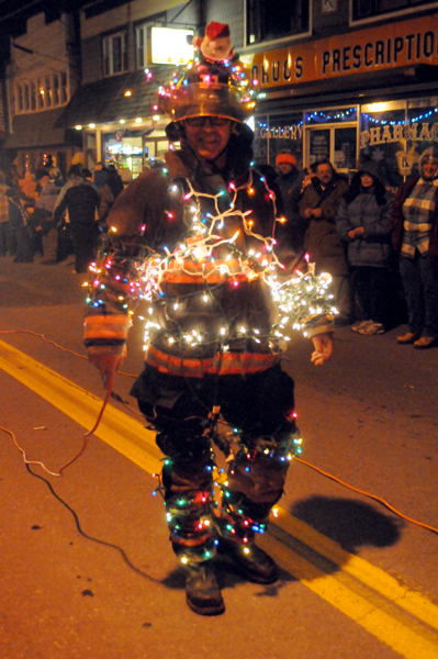 A fireman all decked out in Christmas tree lights helped brightened spirits.
