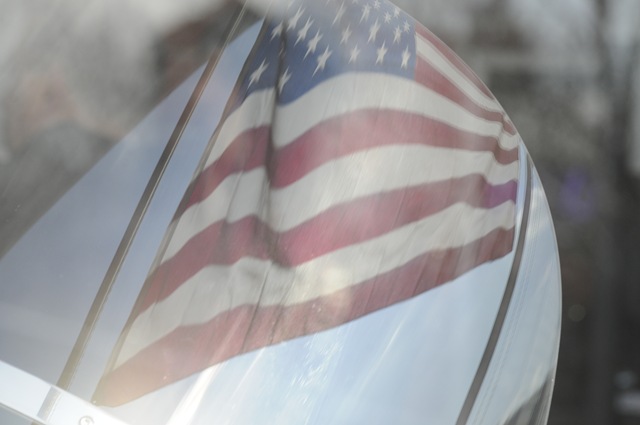 At O’Toole’s Harley Davidson, American Flags rule the day along with iconic American iron: Old Glory is seen through the front window as reflected off a new motorcycle.
