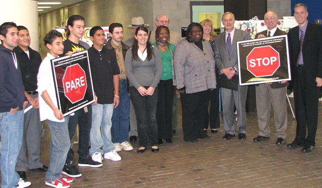 Chair of the CARECORPS group, Larry Schafman, welcomed parents, students, and residents as well as members of the media. He explained the importance and timeliness of this campaign as the holiday season begins. He introduced the following speakers who reinforced the message; State Trooper Sergeant Michael Rushanski, Sullivan County Undersheriff Eric Chaboty, Fallsburg Police Chief Simmie Williams, Catskill Regional Medical Center CEO Steve Ruwoldt, students Jose Lemus from Fallsburg High School and D.R.E.A.M. Tank (pictured here at the podium in the government center lobby), Christina Neist from Tri Valley High School and the Catholic Youth Organization, Judge Josephine Finn and student Matt Sze from D.R.E.A.M. Tank, Rachel Lewis from Sullivan County Youth Alliance, Sullivan County Family Court Judge Mark Meddaugh, and District Attorney Elect Jim Farrell. Also Mr. Schafman read a letter of support from Terri Ward, President/CEO of the Sullivan County Chamber of Commerce.