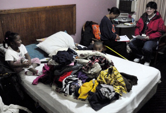 Asked what it was like for a mother and five young children to live in two small rooms with dim light filtering through the blinds and all their clothes and worldly possessions in plastic trash bags on the floor or on the beds, Defreese replied, “It’s not easy, it’s hard. It’s real stressed out being here, I’m real stressed out every day. We don’t have much, and [other] kids are hangin’ out in the hallway.”