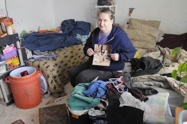 In addition to a couple of beds, they have a stove, a refrigerator and a dresser, even though the a few drawer fronts have fallen off. Have some food? Store it on any flat surface you can find. How about your clothes? Store them in black plastic garbage bags, pile your duds on the beds, or leave the dirty stuff on the floor. A tiny plastic Christmas tree and a photo of her two young sons taken at
