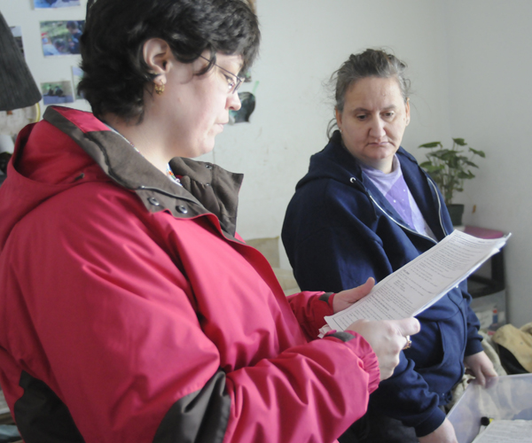 Jamie Latimer, a student support specialist with Sullivan County BOCES A.S.K. looks over some paperwork from social services as Sharon Dodd looks on.