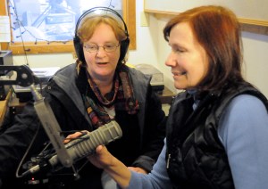 Barbara Gref, former two-time president of the board, supplier of hydro-power to WJFF, and volunteer chats with Bette Popovich, former station manager.