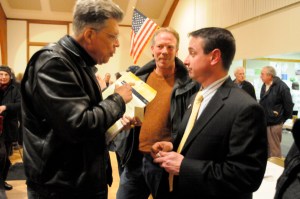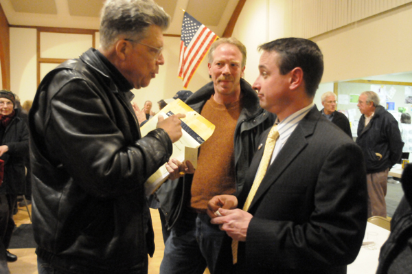 Noel van Swol,(l) president of the Sullivan-Delaware Property Owners Association and Fred Peckham, (ctr) a quarryman from Hancock speak with Calvin Tillman, (r) mayor of Dish, Texas.