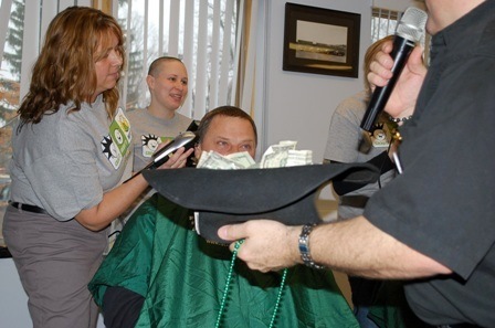 Champion fundraiser this year was Sullivan County Democrat columnist Jeanne Sager who raised $1030. “I asked everyone on my Facebook list, everyone I e-mailed. I sent out so many.” Sager, who has been shaving her head for several years got a couple of really big donations including $200 from her young daughter, Jillian, who got some help from her daddy with writing the check.