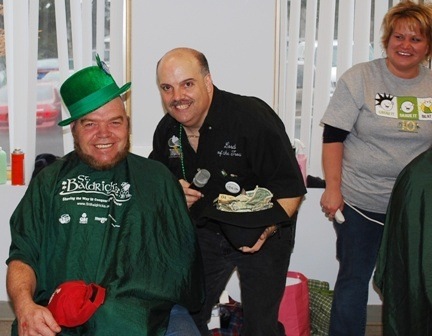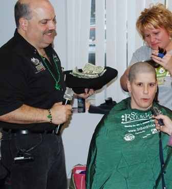 Radio station Thunder 102, which had been promoting the event for several weeks, was on hand, not only to help out, but also to participate. Both Paul Ciliberto of the morning show Ciliberto and Friends, and Mike Sakell of Sakell in the Afternoon decided to participate in the most personal way they could, by getting their heads shaved. “This is the first time I’ve been at a barber that has an audience,” said Ciliberto whose co-worker Regina Hensley said he looked like Dr. Evil from the Austin Powers movie. “What can I tell you, Erin usually cuts my hair so it’s not like I’m nervous or anything,” said Sakell as his hairdresser carved a big 102 on his head with her electric razor. Both Sakell and Ciliberto have been participating for several years now.
