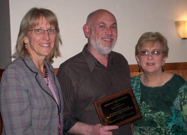MONTICELLO – Les Kristt was presented with a plaque of appreciation by co-chairpersons Sheila Lashinsky and Marcia Fink on behalf of the Sullivan County Alzheimer’s Memory Walk Committee. Les did a fantastic job as their honorary chairperson for many years and graciously offered to continue his efforts as an active committee member.