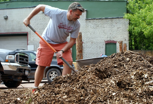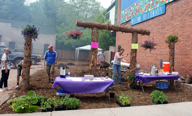 The lot is owned by Peter Belgard, who made the property available to the Liberty Garden Team consisting of Olivia Lightle, Heinrich Strauch, Akira Ohiso, JonJon Thomas, Sullivan Renaissance intern Margaret Goble and Tim Shera. Thomas designed the visual plan that includes three huge rough hewn timbers at the entrance point; giving the garden a “Stonehenge look” as one Liberty resident put it.
