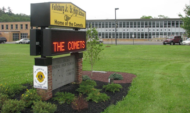 FALLSBURG, NY – After months of hard work and collaboration between Fallsburg Central School District (FCSD), Fallsburg Lions Club, the families of Nat Kagan and Mel Mednick, and the generosity of groups and individuals that contributed funding and their company time and energy, the electronic information sign is up and running on the spacious front lawn at Fallsburg Jr/Sr High School.