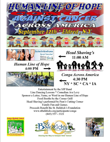 To get involved in any or all of the four ways Monteleone is raising money for St. Baldrick’s: The Line of Hope Dolls, the head shaving, The Human Line of Hope or the Conga Across America, call Monteleone at 845-557-3321 or 845-557-8616.