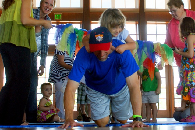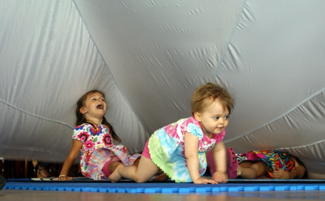 Later, they pass under a limbo stick decorated with colorful scarves, and play under a parachute which is gently raised and lowered to the floor to the tune of Time of the Season.