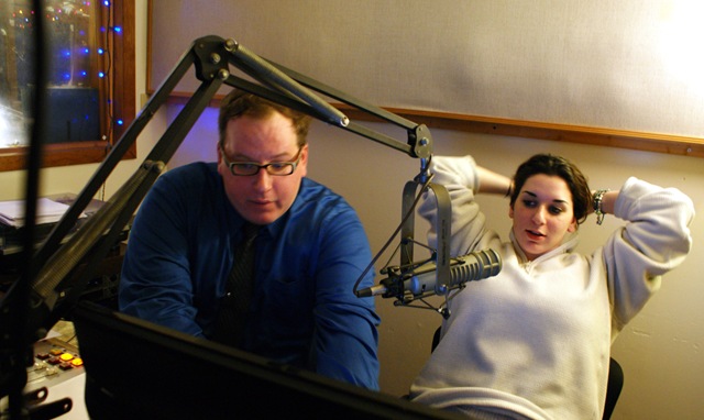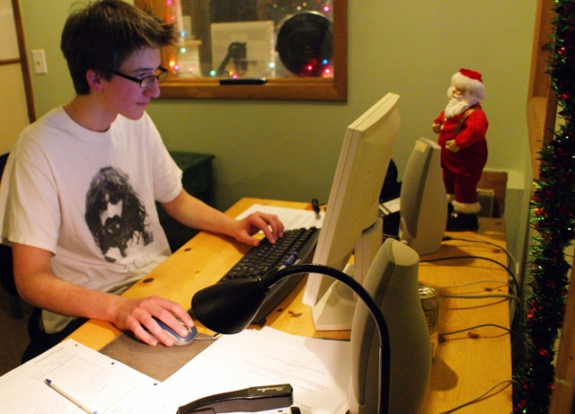 After the voice recording was done, sitting in the WJFF studio last night, I watched WJFF’s Youth Radio Project putting the finishing touches on their X-mas X-travaganza. Audio editing was going on in the production room while Seth was editing and researching sound effects in the main room. Curtis appears and grabs pieces of a script before rushing out the door, vowing to put music to the background.