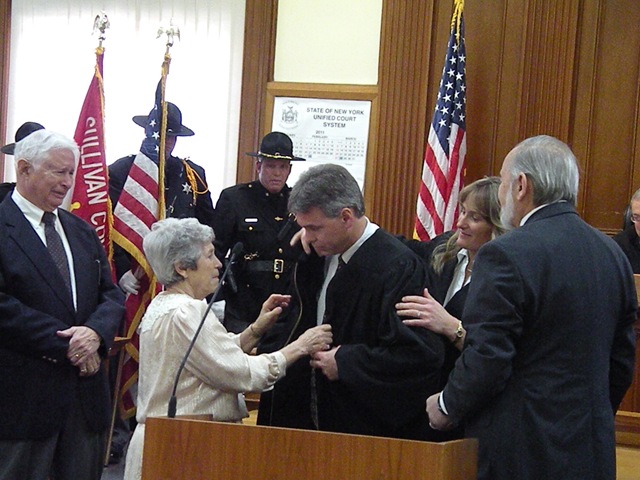 It is tradition for the president of the Sullivan County Bar Association to present the new judge with his/her robes, so Sam Yasgur, assisted by McGuire’s mother and wife, help the new judge don his new robes. Yasgur also had some advice for the new judge.
