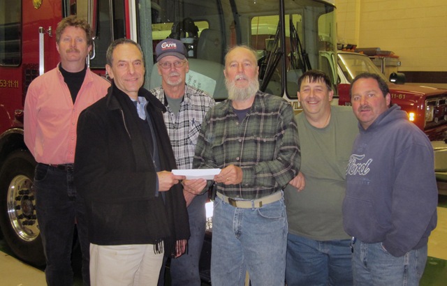 Chris Williams of SYDA Foundation presents John Halchak, Chairman of the Hurleyville Fire District Board, with a check for $10,000. From left to right, Fire Commissioners Jim Sullivan, John O’Neil, George Gibson, and Lee Feldman look on. – Provided photo