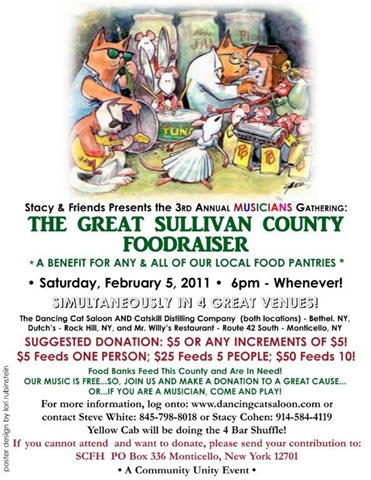 Now too large for any one venue, The Great Sullivan County Foodraiser will take place on Saturday, February 5 from 6:00 p.m. till whenever at three separate locations: Mr. Willy’s Restaurant in Monticello, The Dancing Cat Saloon and Distillery in Bethel and Dutch’s Tavern in Rock Hill.