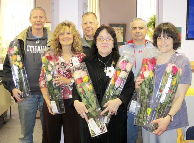 Liberty Rotary Club members (back row l to r) Gary Siegel, Jack Etter and Jack Strassman, present Catskill Regional Medical Center (CRMC) Director of Volunteers Jodi Goodman (front row left) with some of the 40 dozen roses donated to the hospital. Also in photo are CRMC volunteers (front row) Melodie Denner (center) and Corrina Rausch (right).