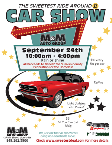 The $10.00 entry fee per car, as well as raffles and all-you-can-eat barbecue will benefit the Sullivan County Federation for the Homeless.