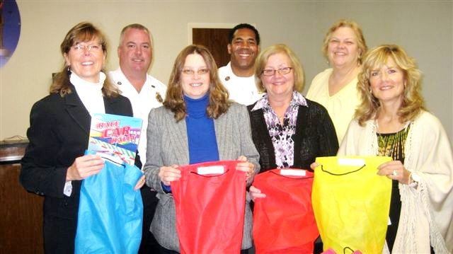 Photo (l-r) front and displaying children’s activity bags:Monticello Kiwanis Past President Sharon Jankiewicz, President Lori Benjamin and member Christine Mahoney, from CRMC Jodi Goodman. Rear (l-r): Monticello Chief Doug Solomon, Fallsburg Chief Simmie Williams and Woodridge Kiwanian Joan Collins.