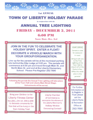 The Town of Liberty Parks and Recreation Department will host its first annual Town of Liberty Holiday Parade in conjunction with the Town’s annual Holiday Tree Lighting ceremony. Join in the fun to celebrate the holiday spirit by entering a float, decorate a vehicle, or march with your group/organization. We are also looking for anyone who has trucks and trailers who would be willing to allow groups to decorate them for a float and you drive them through the parade.