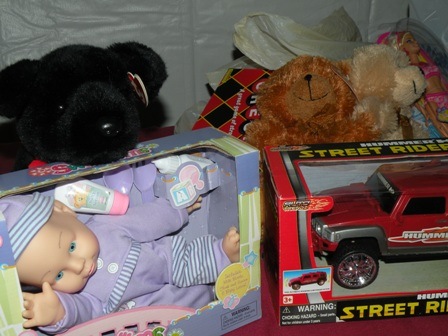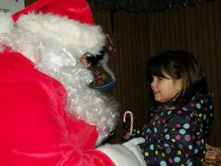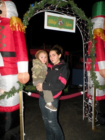 Families brought toys for the Toys-for-Tots collection sponsored by the Marine Corps League, and then young and old alike delighted in the train ride aboard the Hilltop Express. As families walked around the spacious Santa Village, they saw trees and lights, and large balloon-type
