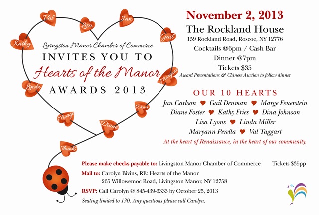 The annual Heart of the Manor Award this year will go to the ten individuals who worked so hard on beautifying town for Sullivan Renaissance that Livingston Manor won the top award of $25,000. A dinner honoring Jan Carlson, Gail Denman, Marge Feuerstein, Diane Foster, Kathy Fries, Dina Johnson, Lisa Lyons, Linda Miller, Maryann Perella, Valerie Taggart. will be held on November 2 at the Rockland House. For information, call Carolyn Bivins at 845-439-3333.