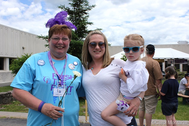 The color purple was everywhere – on T-shirts that said “Finish the Fight,” on the arch of balloons marking the Relay’s start, on signs, on lanyards, and on costumes of feather boas and hair decorations.