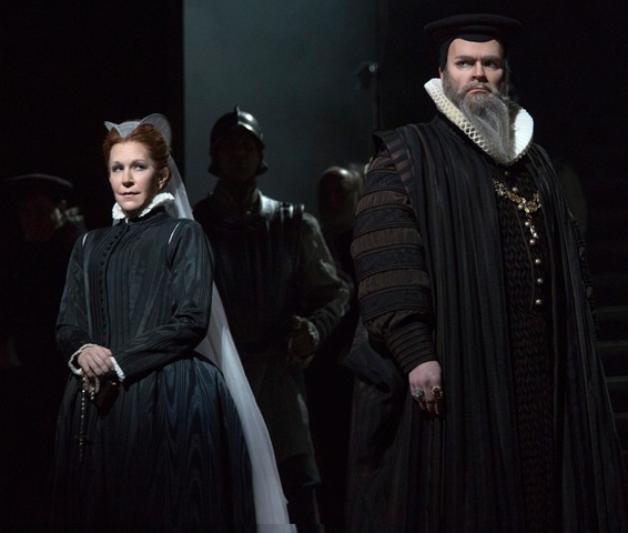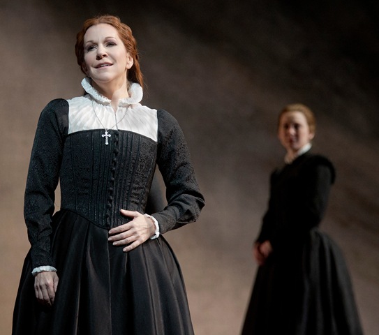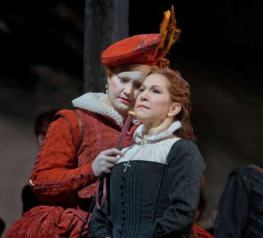 The roles of Maria and Elisabetta were written for sopranos. Many productions, dating from the late 1950s onwards, cast a mezzo-soprano as either Maria or Elisabetta. And for this production mezzo Joyce Di Donato (at right in photo) sang Maria and soparano Elza van den Heever (at left in photo) sang Elisabetta. With exaggerated and fascinating costumes for Elisabetta and stark plain ones for Maria, crafted by John Macfarlane, McVicar offered us a wonderful projection of the differences in the two characters by their different walking/striding, by their different relationships with the others on stage with them, and all following the dictates of the libretto.
