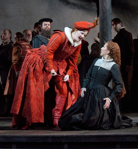 The three males, the three Jacks, in this production of Gaetano Donizetti’s “Maria Stuarda” function primarily as stage props, with the appropriate function of facilitating the story line. Talbot and Cecil are adequately and brilliantly portrayed by Matthew Rose (at left in photo) and Joshua Hopkins respectively. However the remaining Jack and consistent with the quality of vocalists on stage, is Matthew Polenzani (at right in photo), a gifted lyric tenor who portrays the “all-flash-no-cash” Roberto, Earl of Leicester. His talents are clearly evident in this and other productions of the Metropolitan Opera House. Valiant as his efforts are, the cards continue to speak for themselves: Two Queens Beat Three Jacks!