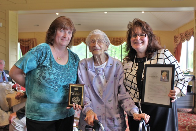 Special Honor Awards were presented to: Mae Kratz (photo above with Caryn Matthews) – the longest active term volunteer since 1973; Marie Zalesky (photo right with Elaine Finkle and Caryn Matthews) for being the eldest RSVP Volunteer at 105 years young, serving at Grover Hermann Division of the Catskill Regional Medical Center since 1975; and Marcelle Wagner