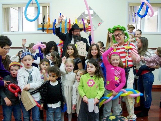 The children were greeted by the Rabbi and his family as well as Dr. Professor Balloon-a-Kiss, who did a magical job making balloon sculptures, and Miss Sunshine the Clown, who painted Chanukah symbols on their faces.