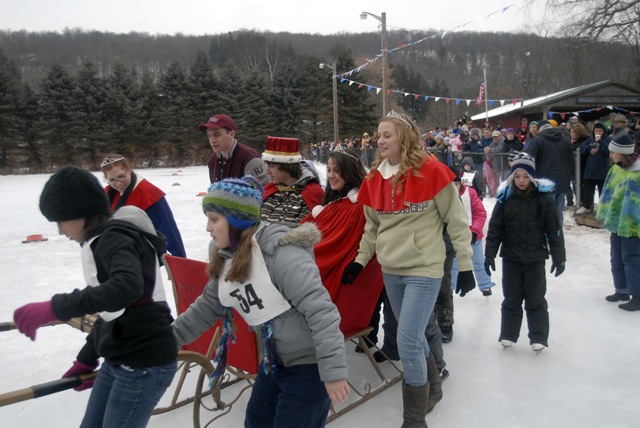 On Sunday, the carnival featured a host of events including snowshoeing, a dog sled demonstration, mule drawn wagon rides, the Traditional Parade of the 2010 Ice Carnival King and Queen and their court around the Walter Seeley Memorial Skating Rink, skating exhibitions by regionally and nationally ranked skaters, races on the ice for skaters of all ages and abilities, and then free skating for everybody who dared to take to the ice on skates.