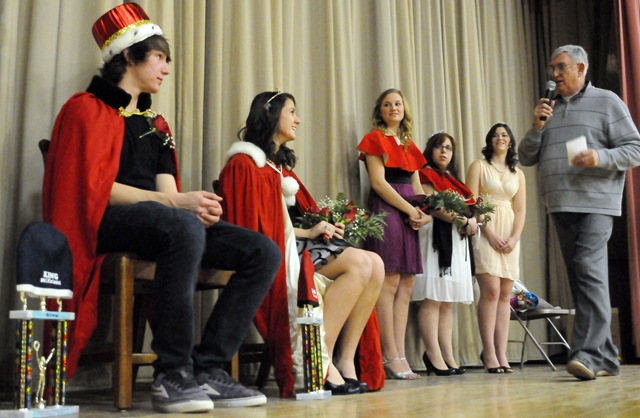 The yet-to-be-announced king and queen, last year’s royalty and members of the court entered the auditorium, four boys from the right and four girls from the left, walking singly down the aisles until they met as pairs in the center of the floor before walking up to the stage and into their rightful places in local history.