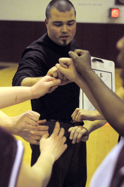 Lady Falcons coach Carlton Williams handed off the ball to his assistant Merissa Dunlap for a few brief post-game comments.