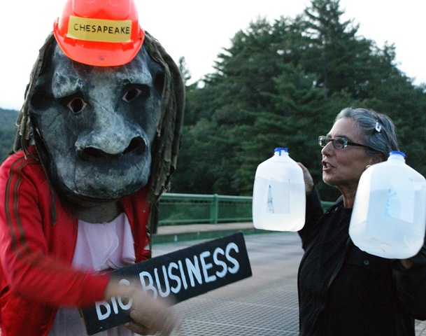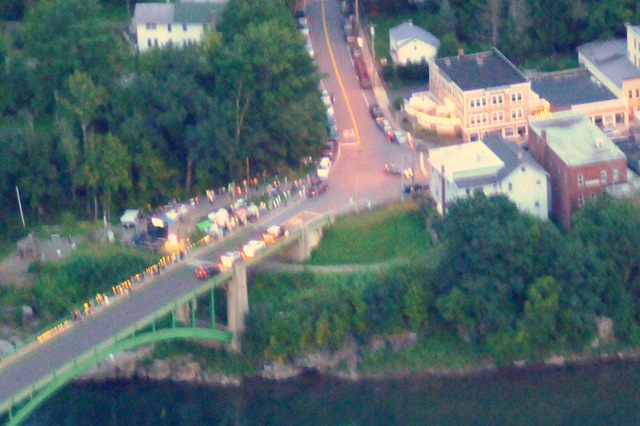 In Narrowsburg approximately 275 people came out to watch “Water Under Attack,” pour a cup of water off the Narrowsburg Bridge and light a candle. Folks showed up with signs, puppetry and good wishes for the river and for the environment; many had been there throughout the afternoon having either taken part in or watched the Toxic Canoe Regatta earlier that day.