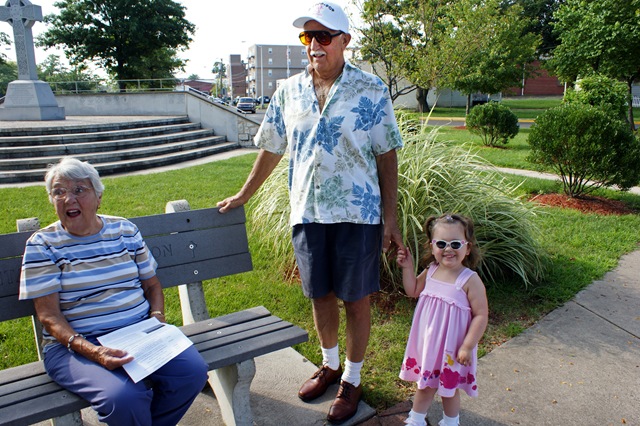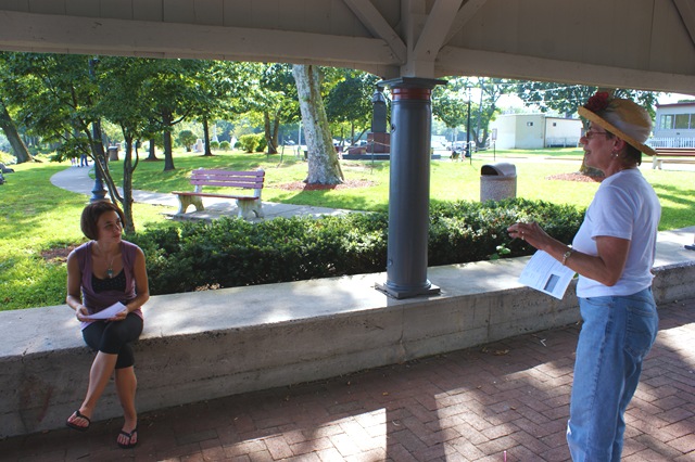 We met young people in the park, older folks, business people and grandparents. While I was talking to the photographer and others, Liz was talking to a woman whose child was playing in the shade and a family who were fishing at the river’s edge. Some of these people took the flyer-invitation and said a quick thanks; others engaged in long conversations. As for us, we added parks to our list of places that we should stop along the way. We also added laundromats, and later on delis and barber shops to the list.