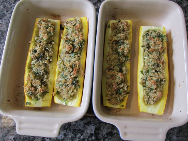 Preheat the oven to 425 degrees. Wash the zucchini, trim both ends, and cut in half lengthwise. With a melon-baller or teaspoon, scrape out seeds and some of the meat from the center, forming a groove down the length of the zucchini.