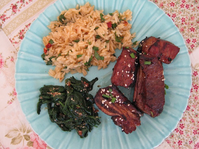 The hostess couldn’t have been more pleasant, warm, and informative, which made the dining experience even more enjoyable than it already was considering we were dining al fresco on a deliciously warm evening as the sky slowly darkened. Our entrees arrived along with bowls of seasoned rice. Jaeyuk bokeum consisted of a platter piled high with grilled pork loin strips that had been marinated in a mixture of red pepper soybean paste, sesame oil, chopped green onions, garlic, and sesame. The meat was tender and gently spicy. Next was an outstanding galbi barbeque, juicy slabs of tender beef short ribs that had been marinated in Asian pear juice, rice wine, soy sauce, garlic, sesame seed oil, and a touch of sugar. We couldn’t get enough of them. That is, until the dolsot bibimbap, one of the “chef’s specialties” arrived sizzling in its stone bowl. I had the honor of gently stirring the bean paste into the mixture of vegetables, beef, egg, and rice and ensuring that each of us got a nice big portion of the crisp and crusty rice that lined the bottom of the bowl.