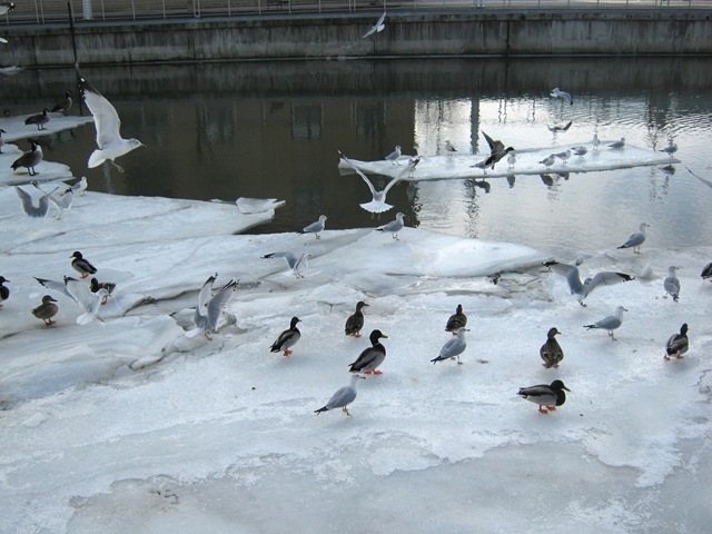 We parked the car within view of the restaurant and made our way there through the slushy, snow covered streets, stopping to gaze down at the Hudson River where ducks and seagulls had congregated by the edge of the water and on ice floes. The restaurant seemed to be rising from the water and its massive glass walls were impressive.