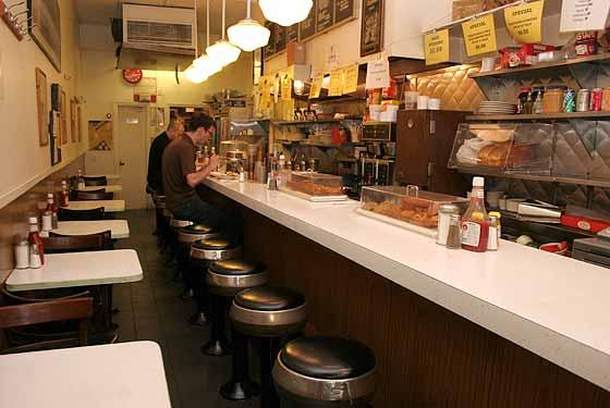I took to it immediately. There was a long counter with a dozen wobbly swiveling, lumpy stools. Along the left-side length of the slim room were four little tables and a couple more that could seat foursomes. The aisle between the counter and the tables wasn’t quite two-feet wide. Everyone eating there looked like a seasoned regular. And quite a mish-mash of mankind they were. No one seemed to mind the cramped quarters one bit. There was no wait staff, so the counterman hollered out the food orders for those sitting at the tables, who then stood and leaned across the crowded counter to retrieve their vittles.![]()