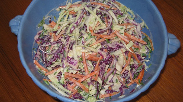 In as small bowl, whisk together yogurt, mayonnaise, zest, juice, sugar, salt, and pepper. Place cabbages and carrots in a large bowl. Pour dressing over all and toss well. Add chives and parsley and toss again. Refrigerate for an hour or so to allow flavors to develop. Taste for seasoning and serve.