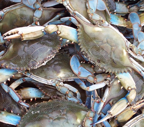 Live crabs stretch and climb over each other, sometimes toppling over the edge of the squat grey tubs in which they are piled. I watch as one skittles across the pavement toward freedom. There are tiny cockles, long thin razor clams, sleek black mussels, littlenecks, huge chowder clams, squid, octopus, conch, scallops, frogs, and eel. Whole fish, from silvery little sardines and sprats to cod, snapper, and sole lie in slippery pyramids on beds of crushed ice.