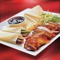 Meanwhile, our waiter outfitted our table with a large fancy-looking covered silver dish; a small oval plate of thin strips of cucumber and scallion, and a ramekin of hoisin sauce – a condiment made from soybeans, mixed with sugar and Asian sesame oil. Finally, the sliced bird was brought forth and our waiter uncovered the silver lid of the chafing dish, and we saw the stack of ultra-thin steamed pancakes that it was keeping warm.