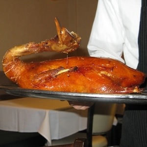 “We want the Peking Duck,” I said excitedly to the waiter. “No kidding,” were clearly the words he was stifling himself from uttering. We sipped hot jasmine tea and waited expectantly. Soon enough we were ceremoniously, though briefly, shown a glistening richly lacquered dead duck, beak and all, before it was whisked away. Nearby we caught a glimpse of a stout man, dressed head to toe in white, expertly slicing the meat and layering it onto a platter.