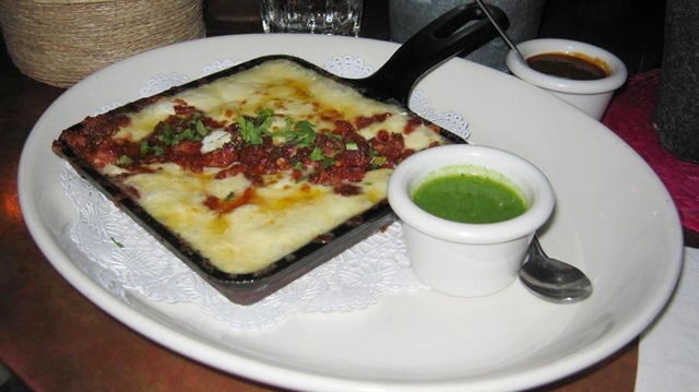 Taquitos, soft corn tortillas filled with grilled marinated skirt (carne asada) with onions, cilantro, and chile de arbol salsa were meaty and full of flavor. Grilled chorizo sausage in a cast iron skillet arrived embedded in melted Oaxacan and Chihuahua cheeses. Impossibly addictive! We stuffed the gooey cheese and chunks of meat into soft corn tortillas and dunked the packets into fresh tomatillo-serrano salsa.