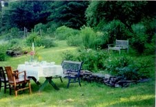 and the birds traversing the tree branches. And I thought about all the times over the years that we’d dined outdoors in friends’ backyards or gardens; on our own lawn on a picnic blanket; and on both the front and back porches, each of which has its advantages according to the time of day and activity in which we’re involved.