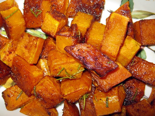 Preheat the oven to 425 degrees. Mix the spices together in a small bowl. Place the squash in a bowl and add olive oil. Toss to coat well. Lightly coat a large rimmed baking sheet with a little more olive oil and turn squash out onto sheet. Spread out in one layer. Season evenly with the spice mixture, salt, and pepper. Bake the squash in the oven for 20 minutes. Turn the pieces and add the rosemary. Return the squash to the oven for an additional 5 – 8 minutes, until golden and tender. Serve immediately or reheat in a baking dish, covered, in the oven.