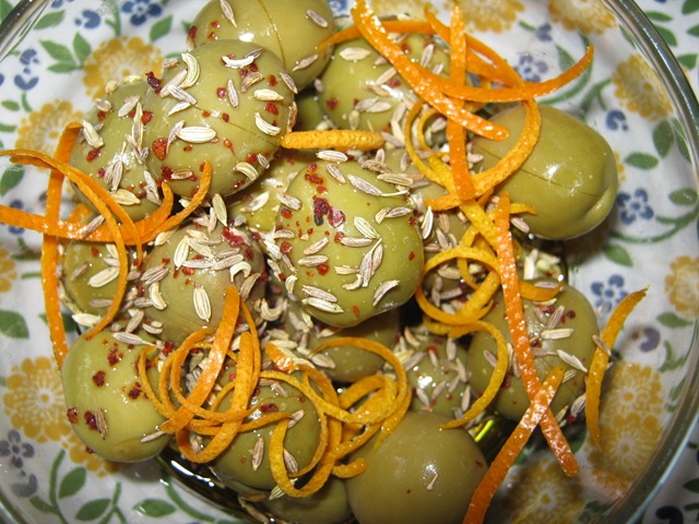 In a dry skillet over low heat toast fennel and cumin seeds until they release a delicate scent. Do not burn. Slide the seeds onto a plate and let cool for a moment. With a rolling pin lightly crush the seeds or you can do this in a mortar and pestle. Do not grind them into a fine powder. Place the olives in a bowl and add the olive oil. Add the toasted seeds, pepper, and orange rind. Stir well to combine. Let sit for an hour or so to allow flavors to meld. Check before serving to adjust flavors if necessary.