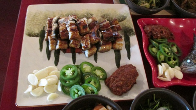 When Janet told me about the Golden Swan, I immediately “Googled” it. They had no website, but I clicked on Yelp and found seven rave reviews, all extolling the grilled eel, apparently the only dish served besides trout. One contributor did mention that the place was pricy, yet absolutely worth it, considering the amount and variety of banchan (side dishes) that accompany the meal, as well as rice, soup, and lettuce leaves for making wraps. ![]()