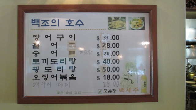 written in Korean and listing prices. “What’s that?” I asked. Turns out there were a few other dishes to be had; a couple alarmingly expensive. She read the list to me: the eel was $33; the trout $28; pheasant $50; rabbit $40; squid $18 and frog’s legs $20.